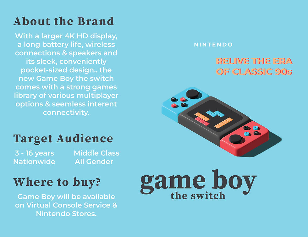The Game Boy is a 8-bit handheld game console developed & manufactured by Nintendo. This design project attempts to reintroduce Gameboy through new brand strategy for today's gen-z generation to reconnect with the classic era of 90s of Gameboy's domination offering a bridge between generations while celebrating the timeless joy of gaming.